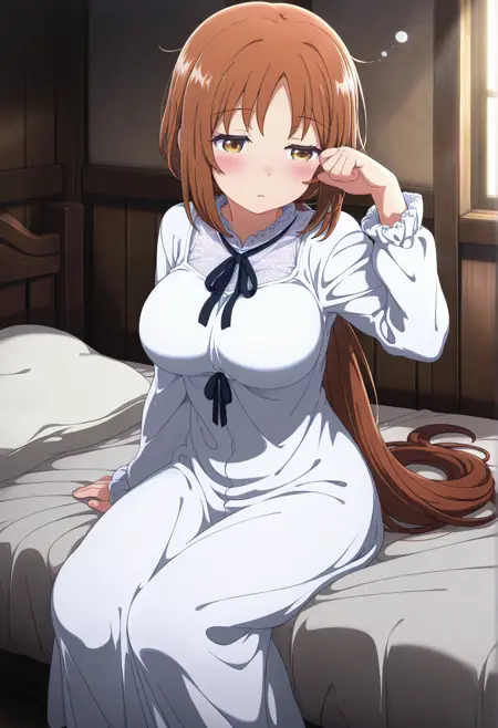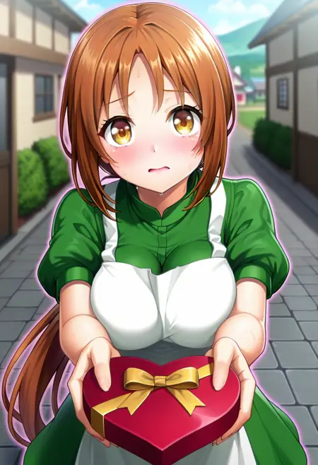 azalea_wz, very long hair, brown hair, brown eyes, low ponytail, green dress, white apron, puffy short sleeves