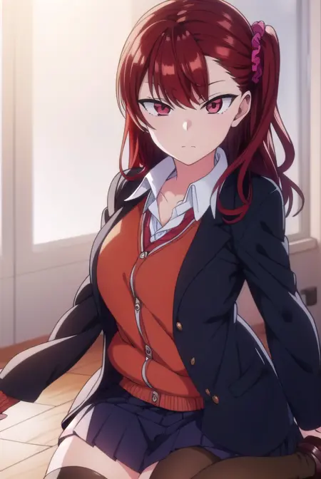 izumi nogami, red hair, one side up, medium hair, scrunchie, (red eyes:1.5),