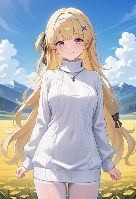 Basic activation words: phoebe, 1girl, long hair, blonde hair, ribbon, hair ornament, blue eyes, very long hair, hair ribbon, x hair ornament, gradient eyes, multicolored eyes, purple eyes