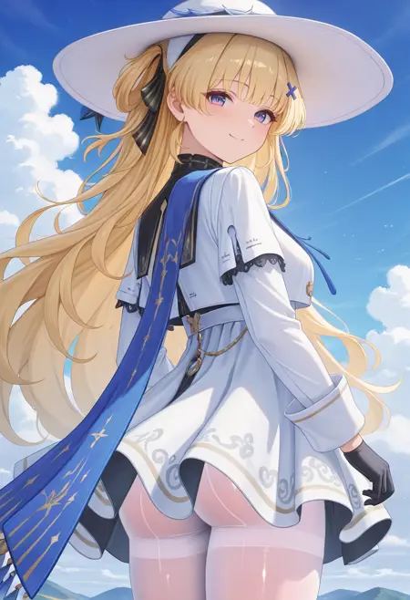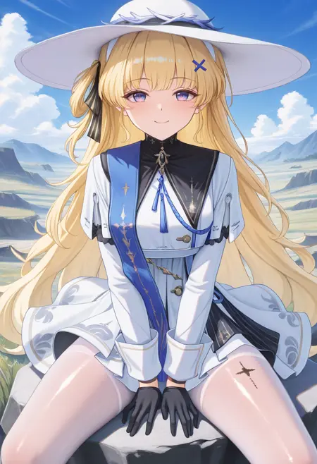 phoebe, 1girl, long hair, blonde hair, hat, white headwear, ribbon, hair ornament, dress, white dress, blue eyes, very long hair, gloves, black gloves, white pantyhose, pantyhose, hair ribbon, x hair ornament, white long sleeves, gradient eyes, multicolored eyes, purple eyes, leg tattoo, tacet mark \(wuthering waves\).