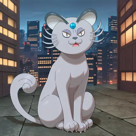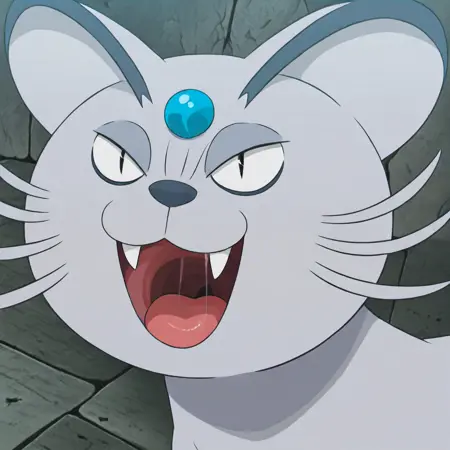 cat, pokemon (creature), gray fur, whiskers, slit pupils, forehead jewel, fangs, claws, cat tail,
