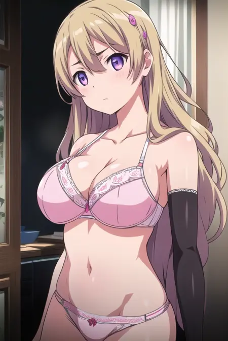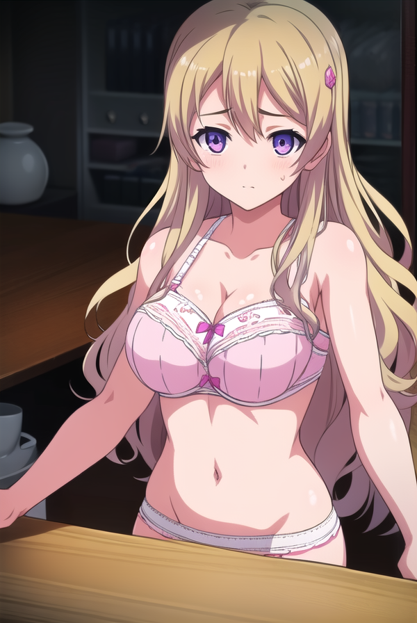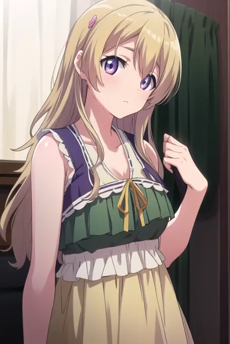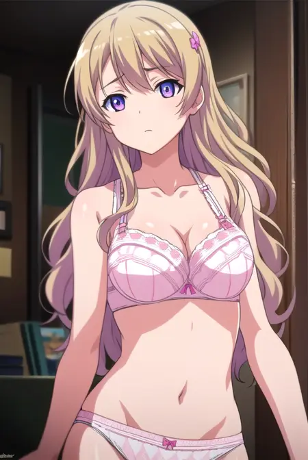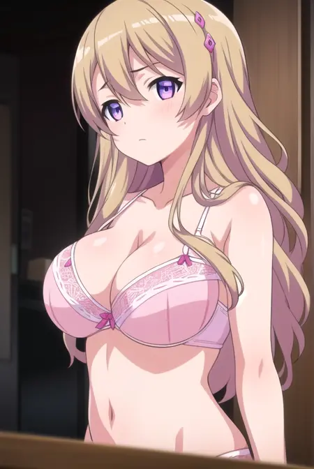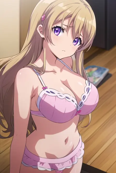 momoka fujiwara, long hair, blonde hair, hair ornament, (purple eyes:1.1),