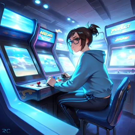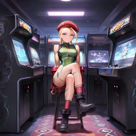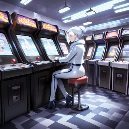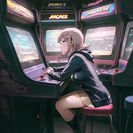 arcade cabinet, arcade, indoors, joystick, ceiling light, checkered floor