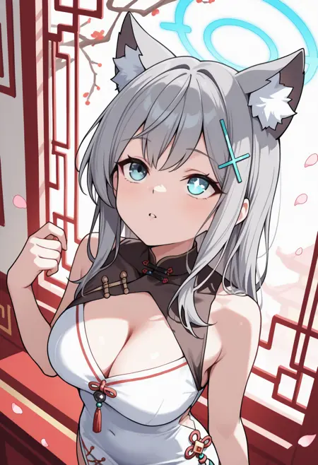 花卉吊饰: shir0koflw, 狼女, 灰发, 动物耳朵, 动物耳绒毛, 额外耳朵, 蓝色光晕, 蓝眼, 不对称瞳孔, 中国风服饰, 白色连衣裙, 旗袍, 无袖连衣裙, 露胸剪裁, 流苏, 露肩