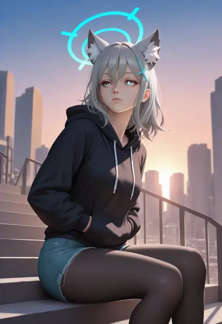 默认服装: shir0kodef, 狼女, 灰发, 发丝垂于眼间, 十字发饰, 动物耳朵, 动物耳绒毛, 额外耳朵, 蓝色光晕, 蓝眼, 不对称瞳孔, 校服, 蓝色夹克, 西装外套, 开襟夹克, 员工证, 长袖, 白衬衫, 衬衫塞入裤内, 胸袋, 蓝色领带, 绿色手套, 单只手套, 黑色短裙, 百褶裙, 格子裙, 过膝袜, 白色袜子, 蓝色围巾, 条纹围巾, 书包
