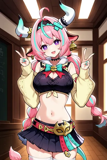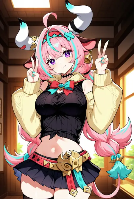 jan-varesa, 1girl, long hair, breasts, blush, skirt, hair ornament, thighhighs, bow, na,pink hair, purple eyes, long cow horns, pink cow tail, ahoge, black shoes, belt, bowtie, short black skirt, black croptop, midriff, beige detached sleeves, cow ears, neck marks, headband, braided twintails, hair ornaments, bell on ear, highlights