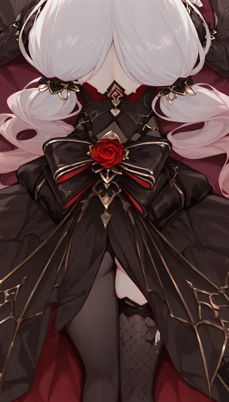 복장: 빨간 눈, 흰 머리카락, 긴 머리카락, 검은 드레스, 빨간 장미, 머리 장식, 긴 소매, 눈 사이의 머리카락, 귀걸이, 검은 허벅지양말, 검은 신발