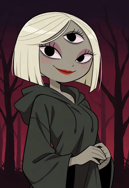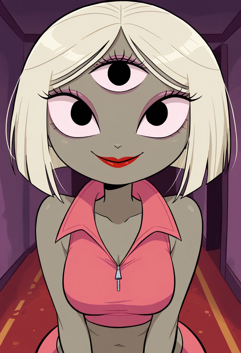1girl, solo, 외계인 소녀, Narc_SJ, 회색 피부, 검은 눈, 세 번째 눈, 백금색 머리카락, 곧고 짧은 머리, 볼륨 컷, 빨간 립스틱