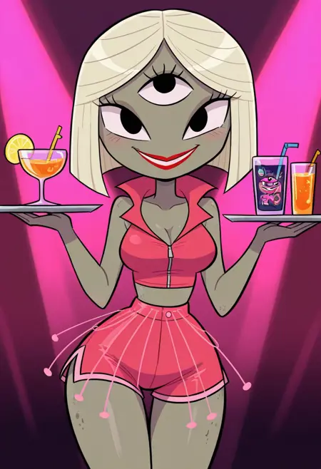 복장: 스탠드 칼라가 있는 핫 핑크 피트 커트 탑, 핫 핑크 하이웨이스트 쇼츠, 분홍 장식, 핫 핑크 힐