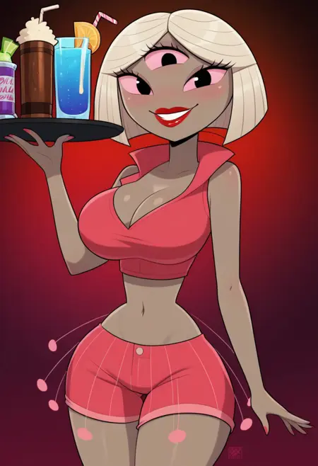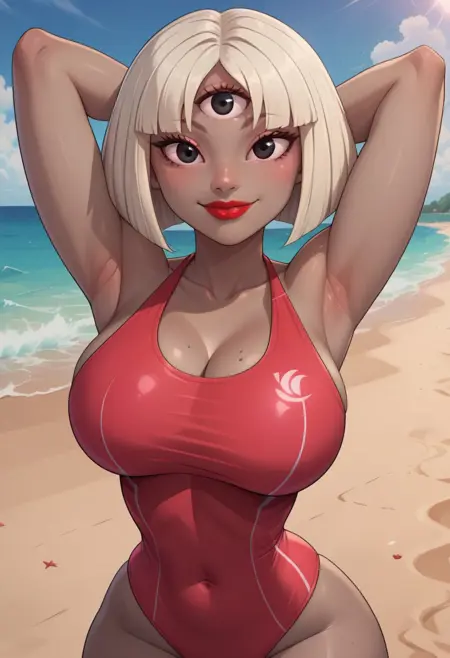 1girl, solo, alien girl, Narc_SJ, gray skin, black eyes, third eye, platinum blonde hair, straight short hair, bob cut, red lipstick