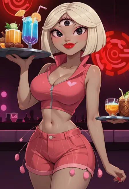 Outfit: hot pink fitted crop top with stand-up collar, hot pink high waisted shorts with pink decorations, hot pink heels