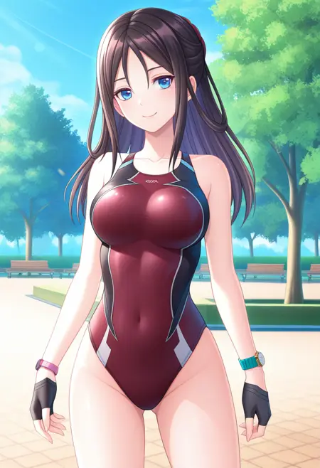 衣装 - ビーサー付きキャップ、赤いワンピース水着、競技用水着、リストバンド、時計、黒い手袋、フィンガーレス手袋