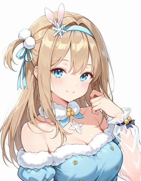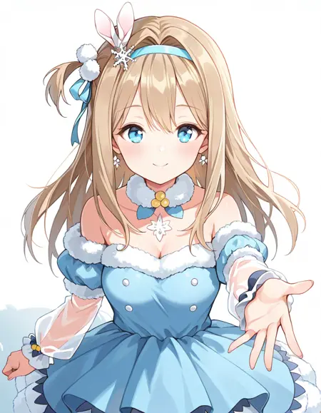 korvatunturi pixie, KP_fur-trimmed_dress, layered dress, off-shoulder, KP_snowflake_neck_ornament, KP_neck_ribbon, KP_see-through_sleeves, KP_hair_ornament, KP_hair_ribbon, KP_detached_fur_collar, KP_wristband, KP_thighhighs, KP_thigh_ribbon, suomi_hairband, suomi_snowflake_hair_ornament, KP_detached_collar, suomi_bunny_hair_ornament, KP_boots,