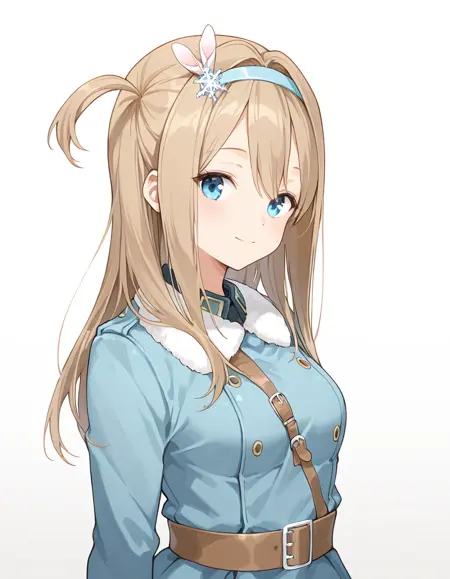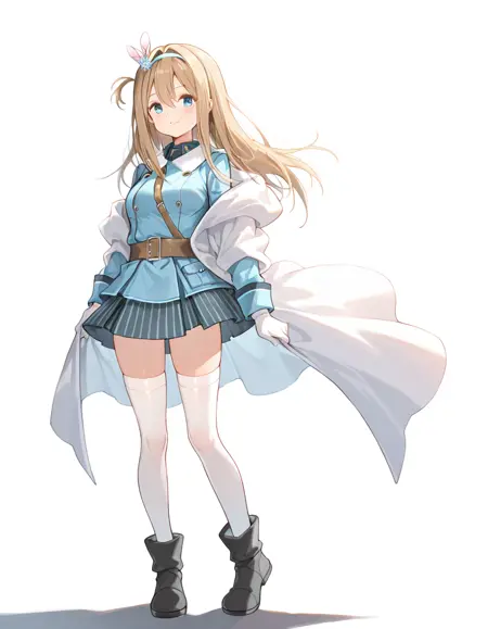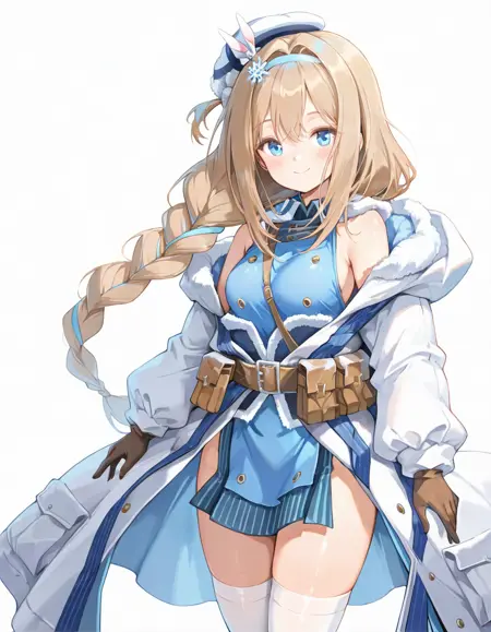 Suomidef, light brown hair, blue eyes, def_jacket, shoulder belt, def_coat, open coat, def_gloves, suomi_hairband, def_skirt, def_thighhighs, def_boots, fur collar, suomi_bunny_hair_ornament, suomi_snowflake_hair_ornament