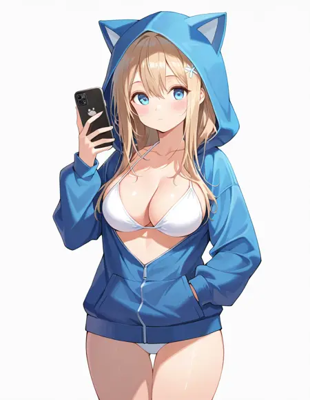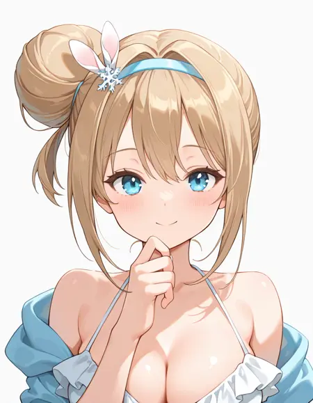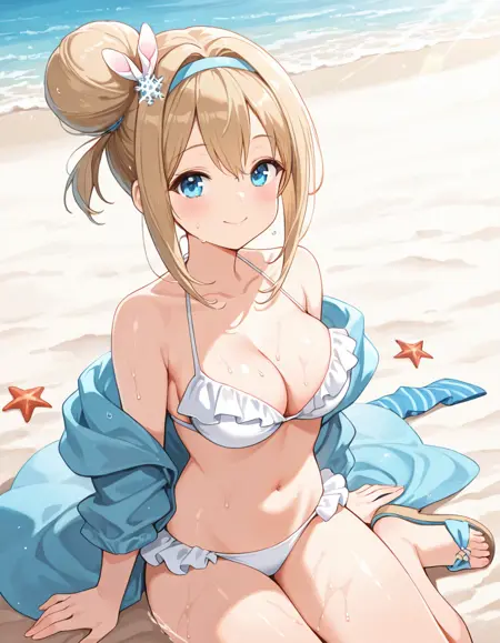 midsummer pixie, MP_frilled_bikini, blonde hair, light brown hair, suomi_hairband, suomi_bunny_hair_ornament, MP_jacket, MP_sandals