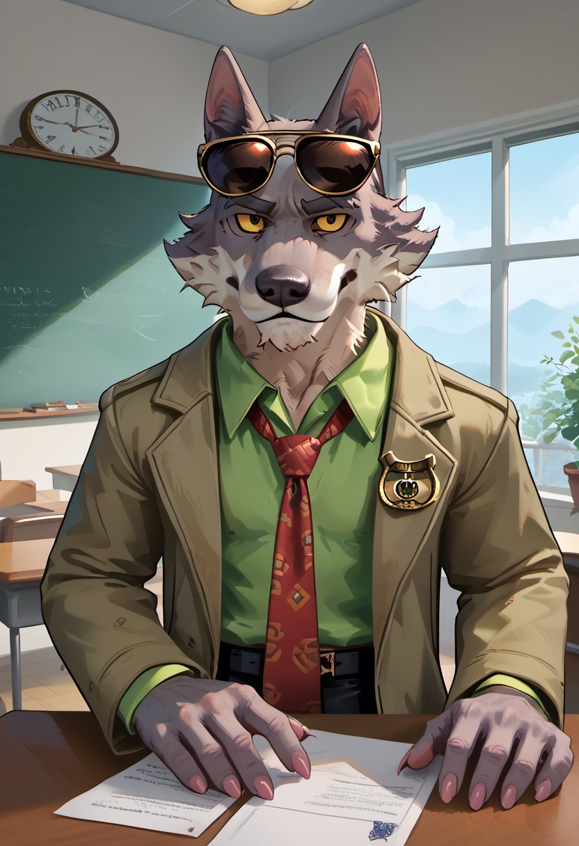 DaleDonovan, 1boy, mature male, male, anthro, wolf, broad shoulders, scruffy, gray fur, light tan underbelly, black eyes, yellow sclera, thick eyebrows, animal ears