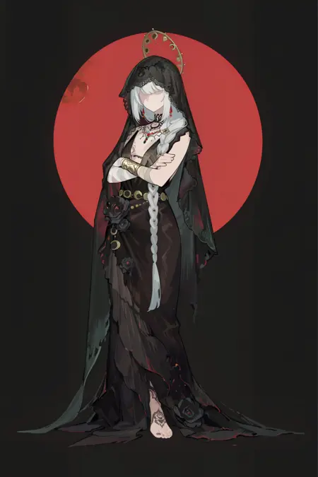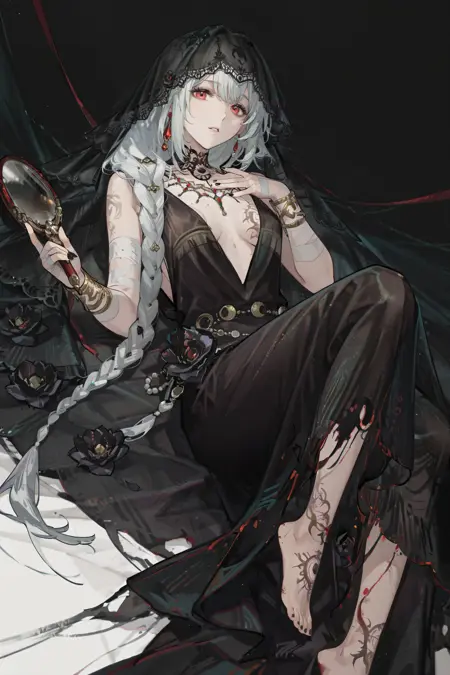黑色面纱,蕾丝镶边面纱,白发,发辫,红眼,极长发,发饰,单辫,耳环,头发垂至肩部,