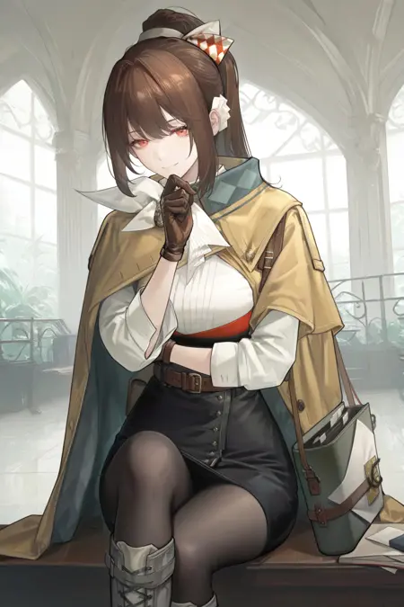 whit bow, scarf, ascot, yellow cape, white shirt, brown gloves, high-waist skirt, black skirt, pantyhose, boots,