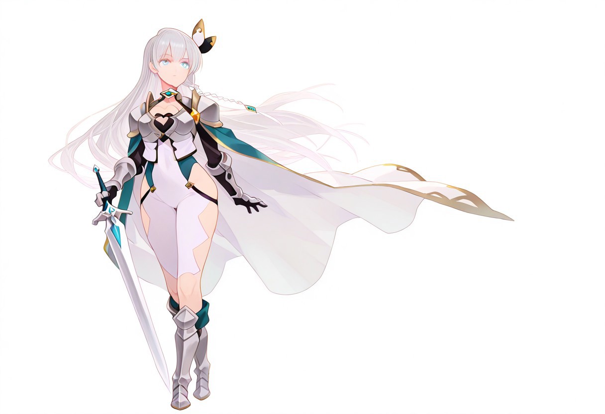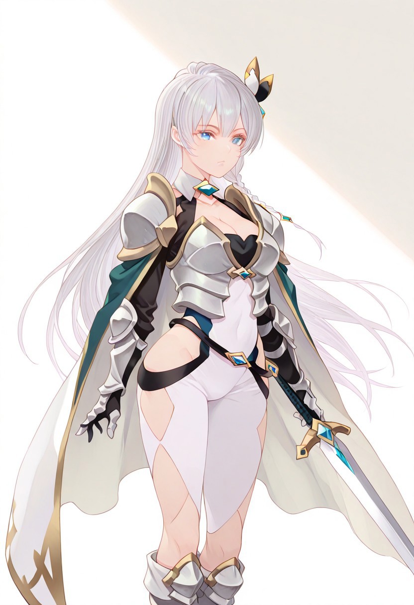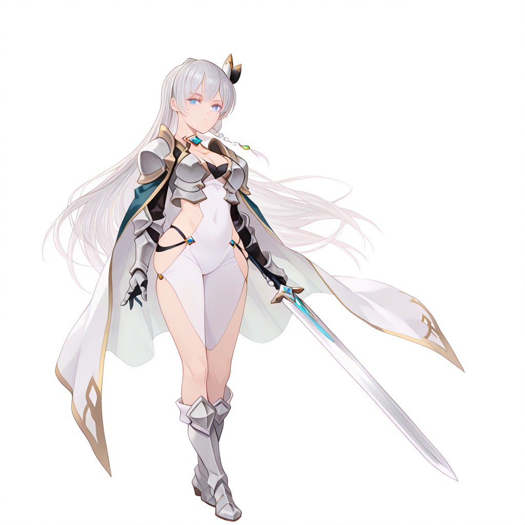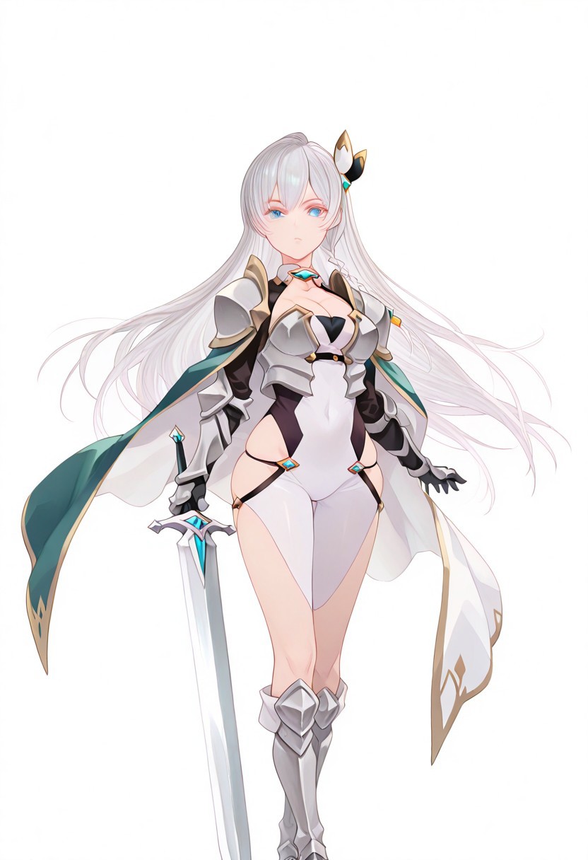allucia_citrus, long_hair, armor, silver_hair, knee_boots, blue_eyes, gloves, white_unitard, sword, medium_breasts, hip_vent, very_long_hair, hair_ornament, cleavage, cape, bikini_under_clothes