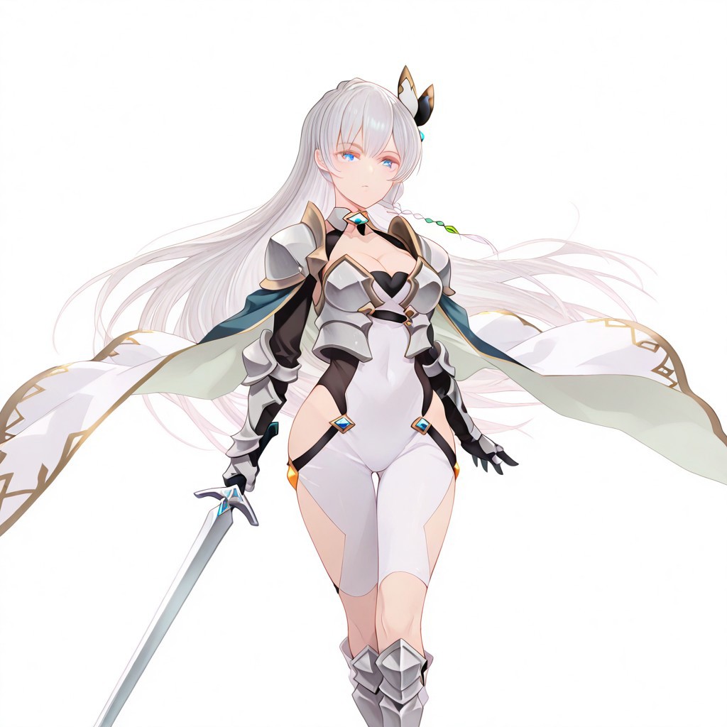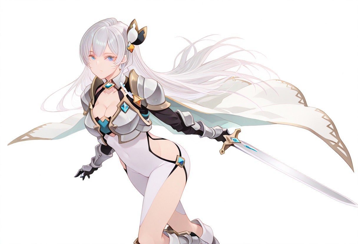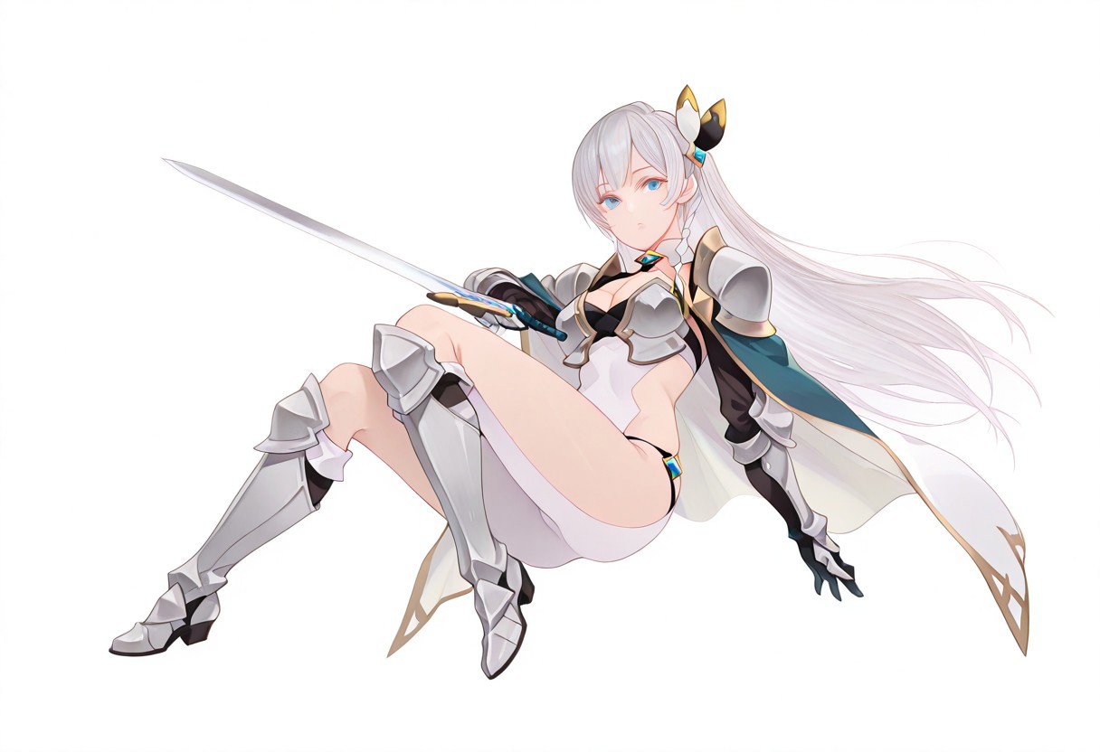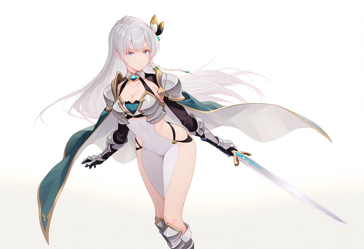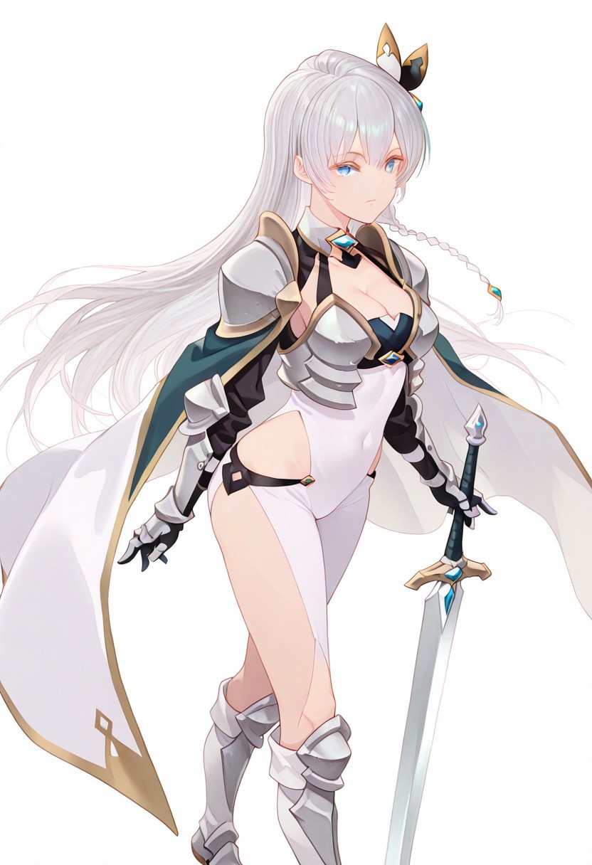 allucia_citrus, long_hair, armor, silver_hair, knee_boots, blue_eyes, gloves, white_unitard, sword, medium_breasts, hip_vent, very_long_hair, hair_ornament, cleavage, cape, bikini_under_clothes