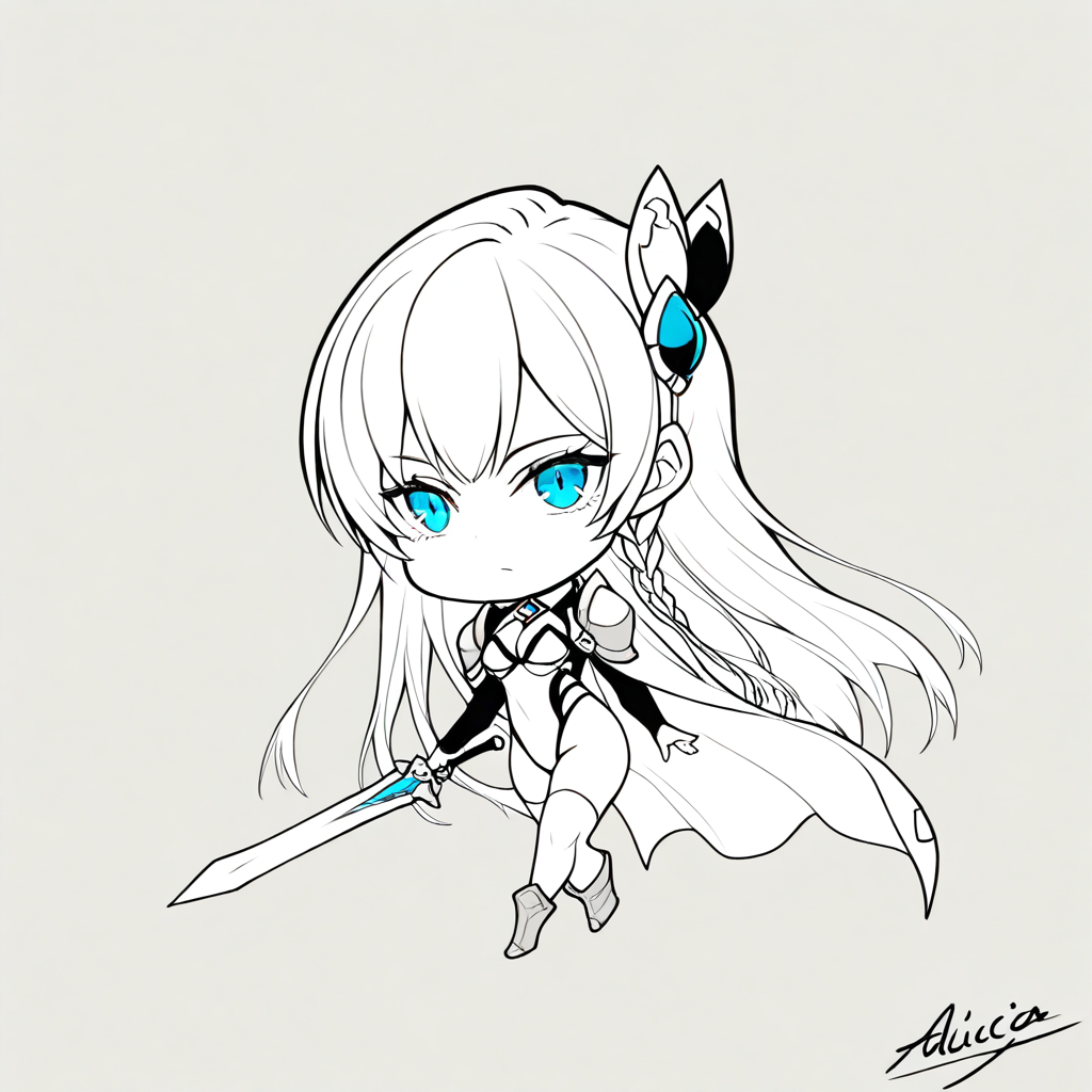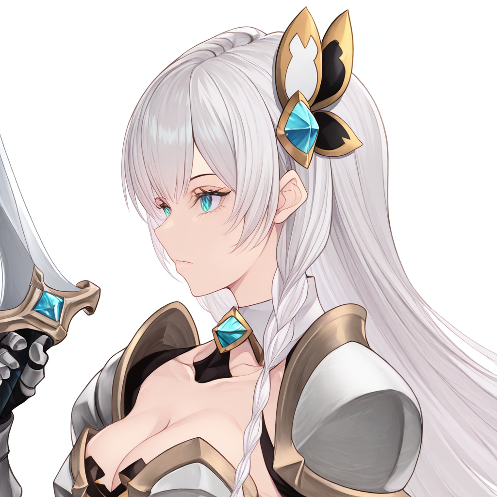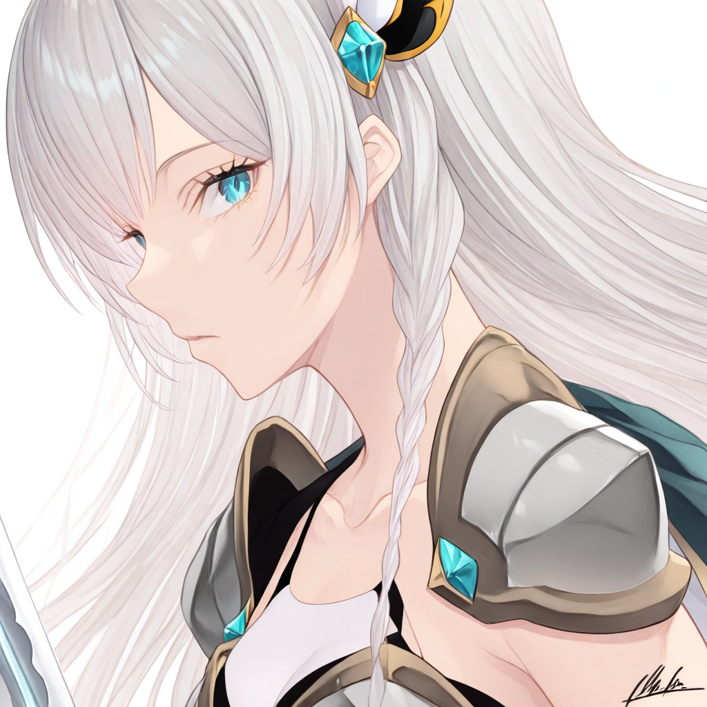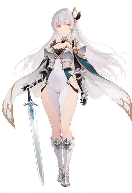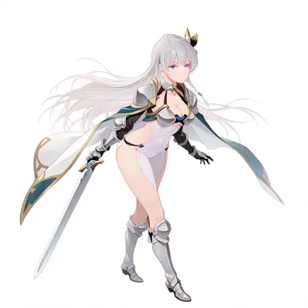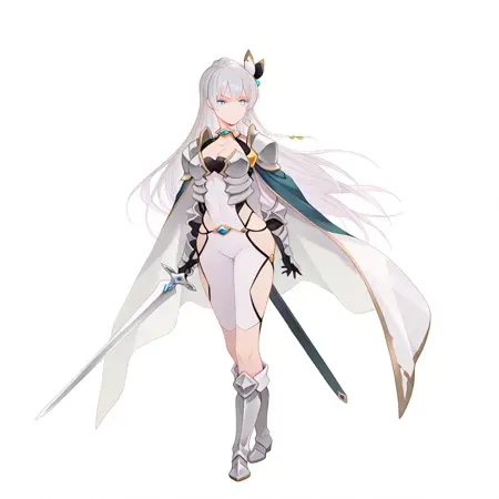 allucia_citrus, long_hair, armor, silver_hair, knee_boots, blue_eyes, gloves, white_unitard, sword, medium_breasts, hip_vent, very_long_hair, hair_ornament, cleavage, cape, bikini_under_clothes
