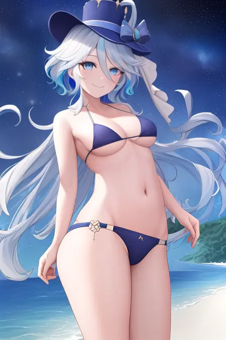 The trigger word is focalors_genshin, and the recommended tags are masterpiece, best quality, highres, solo, {focalors_genshin:1.10}, blue_eyes, hat, blue_hair, white_hair, bangs, hair_between_eyes, bow, smile, ahoge, long_hair, multicolored_hair, blue_headwear.