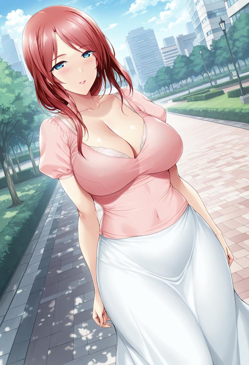 트리거 단어: c-arima, 성숙한 여성, 긴 머리, 빨간 머리, 파란 눈, 머리 위로 묶음,