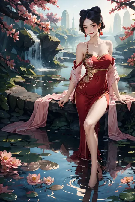 推奨キーワード:1 girl, daji, red dress, chinese clothes, bare shoulders, pink earrings