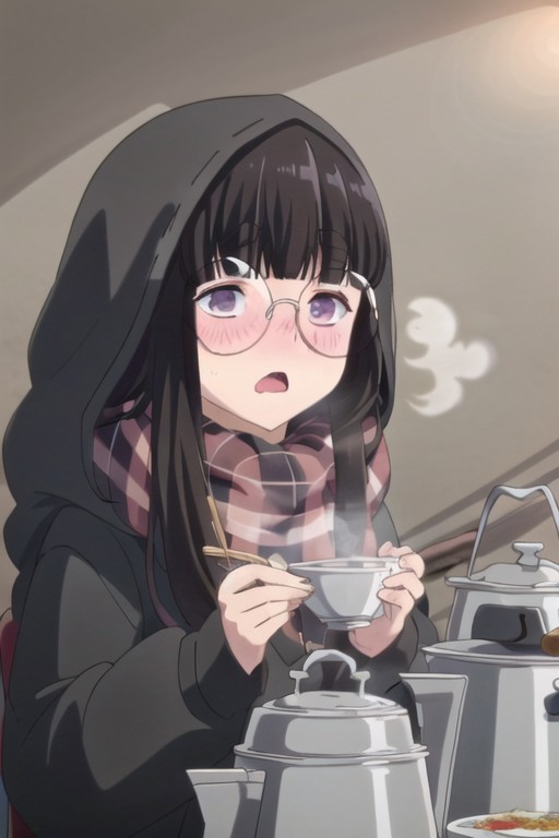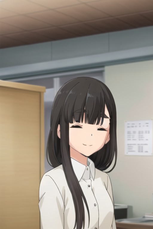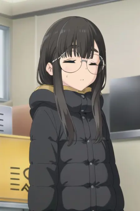 트리거 단어: toba minami, 긴 머리, 검은 머리, 안경, 보라색 눈
