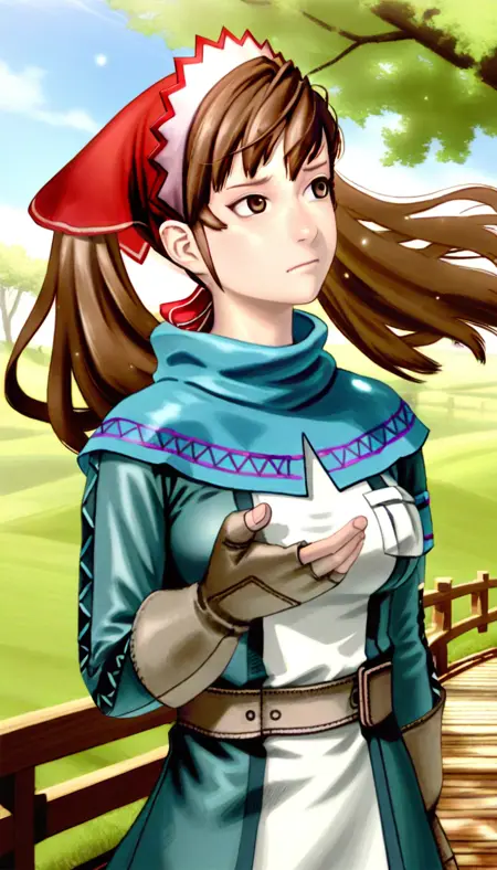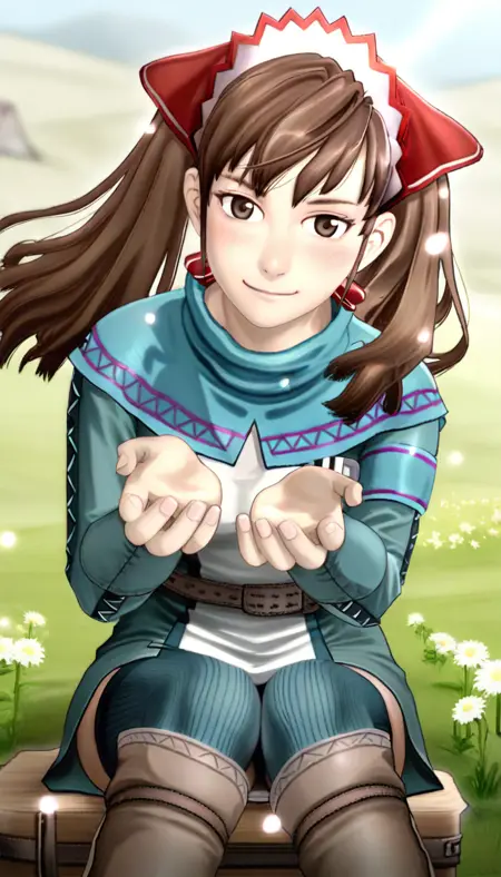 aliciamelchiott, realistic, 1girl, solo, brown hair, twintails, bangs, brown eyes, headdress, cyan shawl, cyan and white dress, brown belt, brown fingerless gloves, cyan thighhighs, brown boots,