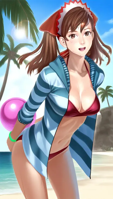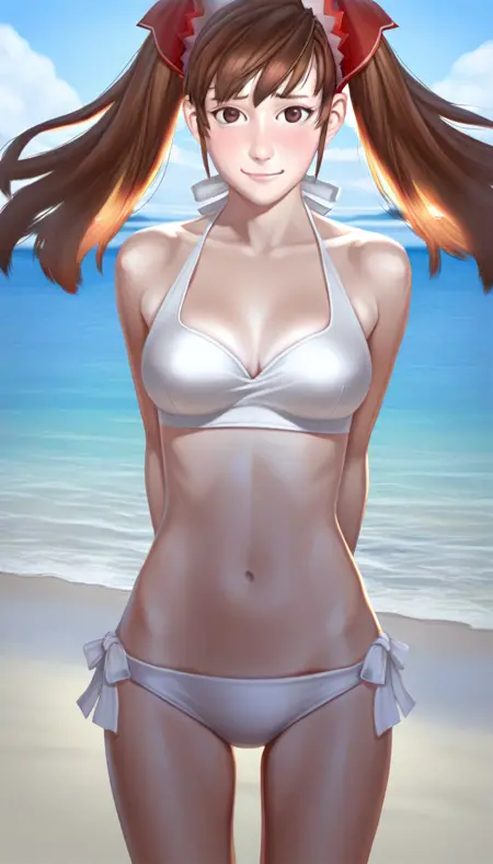 aliciamelchiott, realistic, 1girl, solo, brown hair, twintails, bangs, brown eyes, headdress, blue and white striped hoodie, open clothes, red ribbon bikini, red bikini bottom with dotted ribbon, barefoot,