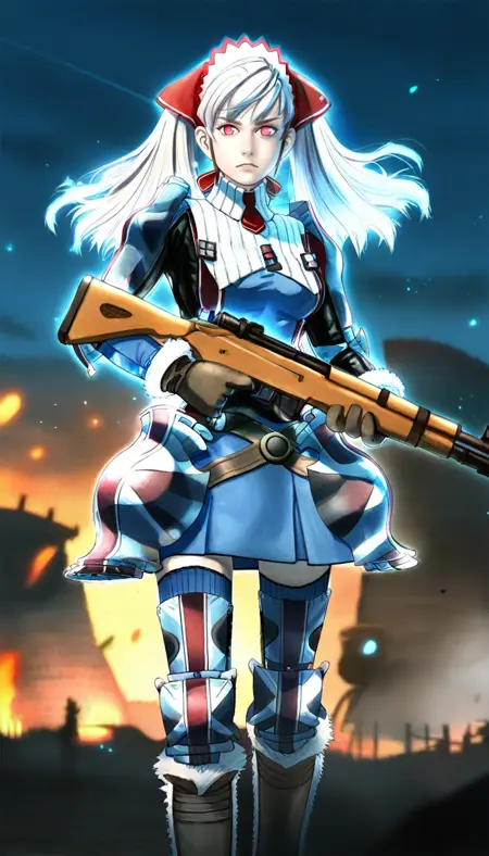 aliciamelchiott, realistic, 1girl, solo, brown hair, twintails, bangs, brown eyes, headdress, military uniform, red necktie, shoulder armor, elbow pads, armor skirt, leg guards, brown gloves with fur trim, brown belt, dark blue skirt, dark blue thighhighs, knee boots with fur trim,