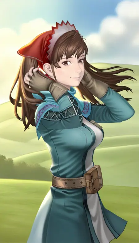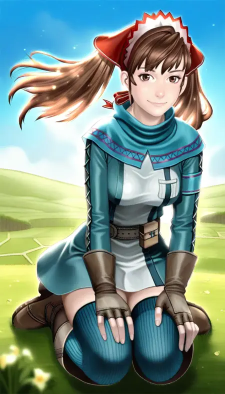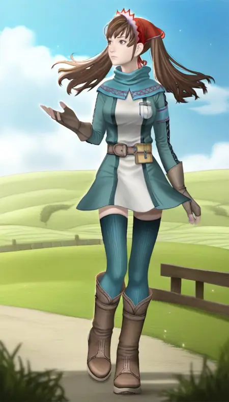 aliciamelchiott, realisitc, 1girl, solo, brown hair, twintails, bangs, brown eyes, headdress, cyan shawl, cyan and white dress, brown belt, brown fingerless gloves, cyan thighhighs, brown boots,