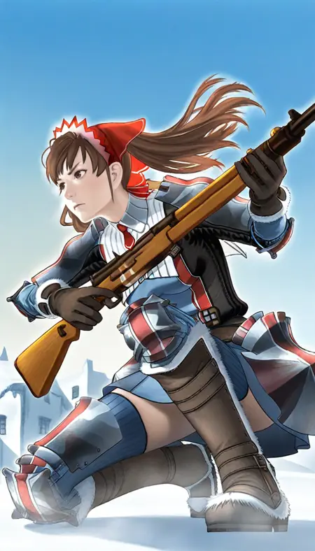 aliciamelchiott, realistic, 1girl, solo, brown hair, twintails, bangs, brown eyes, headdress, military uniform, red necktie, shoulder armor, elbow pads, armor skirt, leg guards, brown gloves with fur trim, brown belt, dark blue skirt, dark blue thighhighs, knee boots with fur trim,
