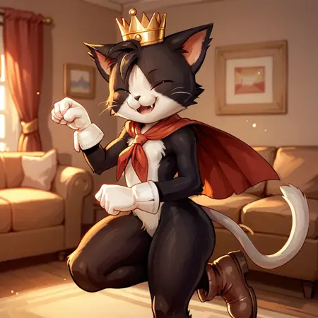 crown, red cape, white gloves, brown shoes