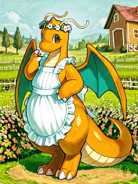 추천 프롬프트: dragonite, 파란색-녹색 날개 안쪽, 날개 막, 줄무늬가 있는 배는 크림색, 작은 콧구멍, 주황색 몸, 머리 꼭대기에는 두 개의 길고 가늘며 뿔이 있으며, 발가락은 세 개