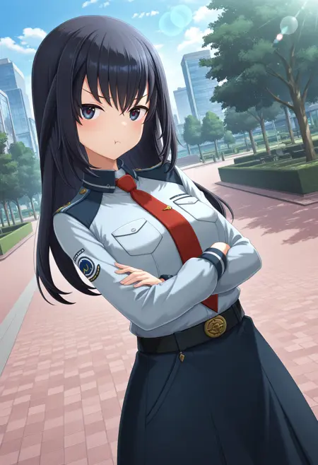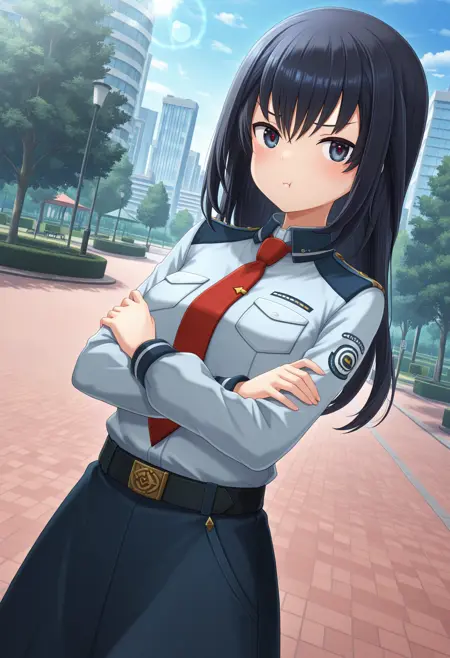 의상: 연한 파란색 유니폼, 파란 치마, 검은 벨트, 긴 소매, 빨간 넥타이,