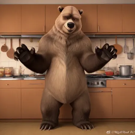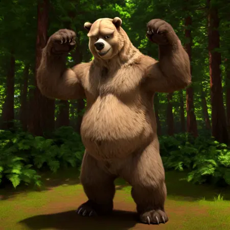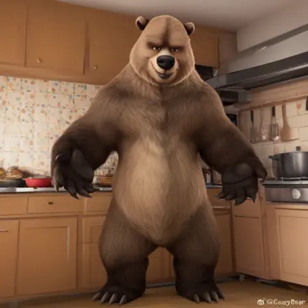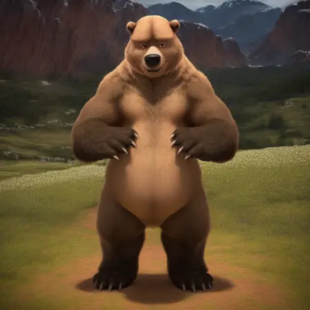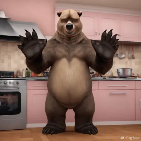 关键词:大熊、大肚子、 bara、浅棕色毛发、黑色鼻子、手爪、脚掌、爪子