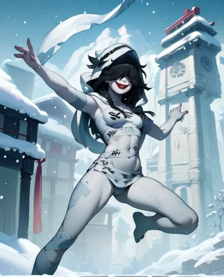 FlyingBolt、目を覆う、髪で目を隠す、赤い唇、-- 笑顔、- 指先、灰色の肌、