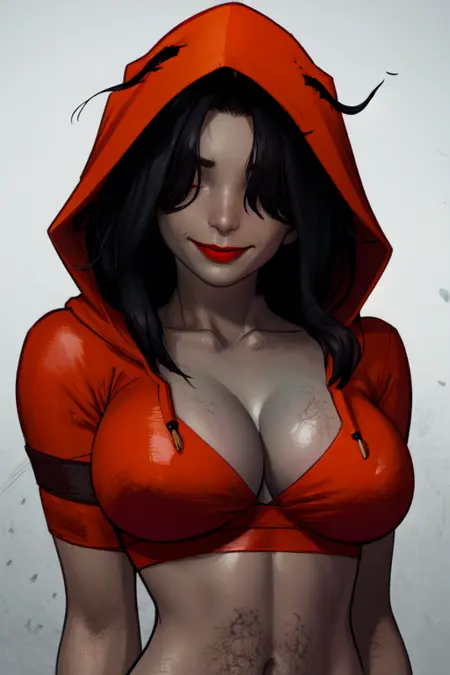 FlyingBolt, covered eyes, or hair over eyes, red lips, -- smile, - fingernails, grey skin,