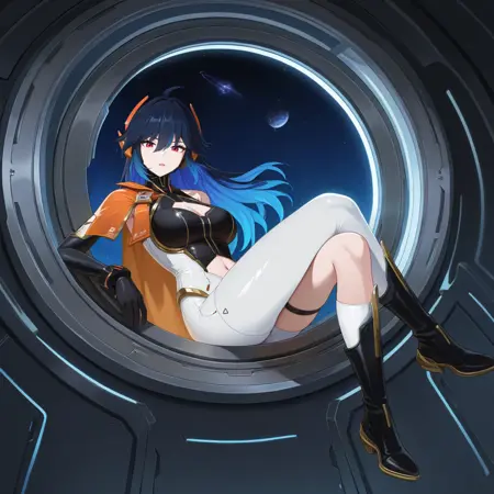 LawineStrv, Fol003, Lwn_Wgb, ahoge, 红色眼睛, 深蓝色头发, 蓝色头发, 彩色内发, 长发, 橙色头饰, 无袖高领紧身衣, 双色紧身衣, 黑色紧身衣, 高领, 白色紧身衣, 单腿紧身衣, 白色腿部护具, 单腿裸露, 肚脐开口, 黑色上衣, 金边装饰, 单肩斗篷, 橙色斗篷, 黑色吊带颈, 胸部开口, 单肩裸露, 长手套, 黑色手套, 无指手套, 黑色腕环, 服装开口, 黑色膝靴, 大腿绑带,