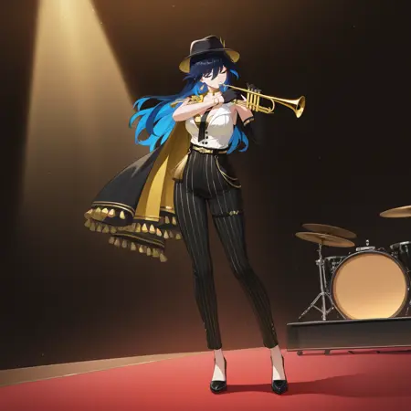 LawineStrv, Fol003, Lwn_Lpr, ahoge, 蓝色眼睛, 深蓝色头发, 蓝色头发, 彩色内发, 长发, 黑色头饰, 风帽, 条纹裤子, 条纹头饰, 黑色裤子, 高腰裤子, 饰品, 无袖衬衫, 白色衬衫, 开襟衬衫, 衬衫塞入裤内, 黑色内衣, 金色文胸, 文胸外露, 黑色领带, 领带, 金色项圈, 单只耳环, 单肩斗篷, 黑色斗篷, 双色斗篷, 黄色斗篷, 流苏边斗篷, 单肩裸露, 黑色单只肘部手套, 黑色手套, 金色手镯, 金色交叉腰带, 黑色腰带, 按扣, 紫色肩带, 黑色鞋子, 大腿绑带,