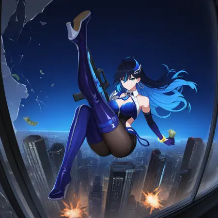 LawineStrv, Fol004, Lwn_Stm, ahoge, 蓝色眼睛, 深蓝色头发, 蓝色头发, 渐变发色, 彩色内发, 头部面具, 开胸紧身衣, 黑色紧身衣, 微型短裤, 黑色短裤, 紧身衣下短裤, 破洞丝袜, 单只耳环, 圆环耳环, 黑色丝袜, 短裤下丝袜, 侧边开口, 带领子衣领, 白色衣领, 蓝色腰带, 单肩裸露, 拉链, 白色肩甲, 黑色单只新娘护腕, 紫色手套, 蓝色手套, 头饰, 颜色错乱手套, 拉链腿部护具, 紫色腿部护具, 大腿靴, 黄色手镯, 蓝色文胸, 拉链文胸, 胸部显露, 半件夹克, 蓝色吊带颈, 拉链上衣, 白色单袖, 拉链袖子, 开衩袖子, 不对称手套,