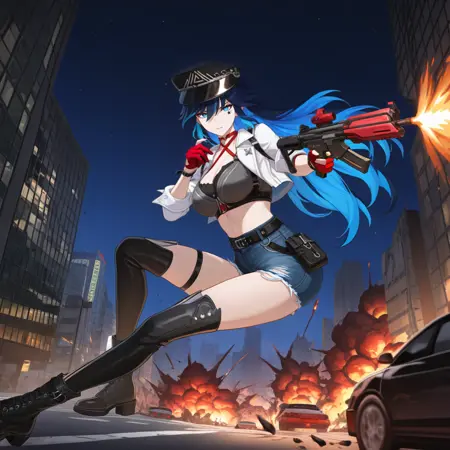 LawineStrv, Fol002, Lwn_Vcr, ahoge, 蓝色眼睛, 深蓝色头发, 蓝色头发, 彩色内发, 长发, 星星纹身, 眼下纹身, 开襟夹克, 开放式服装, 尖顶帽, 黑色头饰, 短款夹克, 白色夹克, 黑色交叉系带靴子, 袖子卷起, 白色袖子, 长袖, 黑色单只无指手套, 红色手套, 腕带, 颜色错乱手套, 腰带项圈, 灰色文胸, 红色项圈, 交叉式吊带, 黑色短上衣, 吊带上衣, 露腹, 装甲背带, 身体背带, 多条腰带, 黑色腰带, 黑色腰带包, 牛仔短裤, 破洞短裤, 高腰短裤, 蓝色短裤, 可拆卸裤子, 黑色裤子, 多条黑色大腿绑带, 交叉绑带,