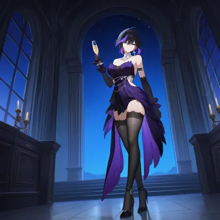 LawineStrv, Fol004, Lwn_Frm, ahoge, 黑色头发, 蓝色眼睛, 短发, 扎起头发, 渐变发色, 紫色头发, 银色耳环, 单只耳环, 黑色连衣裙, 紫色连衣裙, 无袖连衣裙, 白色吊带颈, 侧边开口, 胸部显露, 手臂绑带, 项链, 裸露肩膀, 黑色肘部手套, 百褶腕环, 深紫色腕环, 黑色过膝袜, 过膝袜, 黑色细带高跟鞋,
