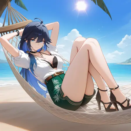 LawineStrv, Fol001, Lwn_Vlo, ahoge, 深蓝色头发, 蓝色头发, 蓝色眼睛, 长发, 低马尾, 绿色短裤, 高腰短裤, 棕色腰带, 部分开襟衬衫, 白色衬衫, 戒指项链, 黑色项圈, 衬衫塞入裤内, 多条项链, 头发垂肩, 文胸肩带, 黑色文胸若隐若现, 黑色手镯, 长腰带, 多个手镯, 印花短裤, 按扣衬衫, 蓬松短袖, 白色袖子, 高跟凉鞋,
