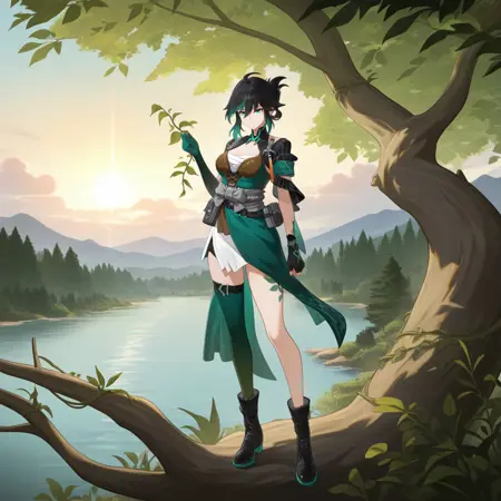 LawineStrv, Fol002, Lwn_Bmf, ahoge, 黑色头发, 水蓝色眼睛, 短发带长发束, 折叠马尾, 渐变发色, 单条独立裤袜, 不对称服装, 绿色头发, 胸部裹布, 灰色腰带, 叶子纹身, 绿色纹身, 腰部绳索, 腰部蝴蝶结, 灰色蝴蝶结, 肩带, 吊带裙, 裙内衬衣, 无肩带衬衫, 棕色衬衫, 层叠裙, 黑色靴子, 白色裙子, 绿色裙子, 绿色连衣裙, 层叠服装, 侧边开衩, 黑色内衣, 可拆卸袖子, 条纹袖子, 黑色袖子, 短袖, 黑色单只无指手套, 黑色手套, 绿色手套, 不对称手套, 绿色单只肘部手套, 黑色单只腕甲, 腰包, 绿色裤袜,