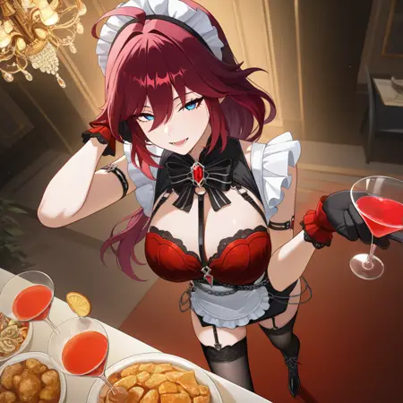 LawineStrv, Fol004, Lwn_Brd, ahoge, 蓝色眼睛, 深红色头发, 低马尾, 长发, 条纹蝴蝶结, 黑色领结, 胸部显露, 带状文胸, 红色文胸, 胸部背带, 黑色臂环, 女仆头饰, 褶边袖子, 短袖, 高腰裙, 白色袖子, 黑色肩带, 褶边围裙, 白色围裙, 女仆装, 黑色短外套, 外套(服装), 红色宝石, 黑色链条腰带, 黑色裙子, 超短裙, 吊袜带, 黑色过膝袜, 蕾丝过膝袜, 褶边腕环, 红色腕环, 黑色手套, 手套, 交叉系带鞋具, 黑色高跟靴,