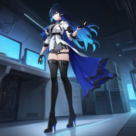 LawineStrv, Fol002, Lwn_Trs, ahoge, 蓝色眼睛, 深蓝色头发, 蓝色头发, 彩色内发, 长发, 灰色短裤, 短款短裤, 侧开衩短裤, 闭合夹克, 白色带领夹克, 单肩斗篷, 蓝色斗篷, 肩章, 链条, 黑色全身紧身衣, 褶边斗篷, 胸部遮盖, 夹克内衬衣, 带领子衬衫, 黑色衬衫, 黑色文胸若隐若现, 灰色领带, 灰色吊坠, 耳机, 白色长袖, 卷起袖子, 扣上夹克, 黑色胸下束带, 替代黑色大腿绑带, 黑色大腿靴, 黑色手套, 部分无指手套, 蓝色手镯, 臂部包, 白色夹克,