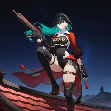 LawineStrv, Fol001, Lwn_Aml, ahoge, 黑色头发, 蓝色眼睛, 绿色头发, 渐变发色, 彩色内发, 低马尾, 长发, 流苏, 中国风服饰, 长裙, 开衩裙, 百褶裙, 黑色裙子, 红色衬裙, 胸甲, 中国盔甲, 黑色紧身衣, 侧边开口, 铠甲紧身衣, 印花盔甲, 肚脐被遮盖, 黑色腕甲, 无指手套, 黑色手套, 红色丝带, 白色衣领, 带领子的衣领, 耳环, 袖子过肘, 双色袖子, 红色袖子, 黑色袖子, 蓬松袖子, 大腿靴, 黑色腿部护具, 多条大腿绑带,